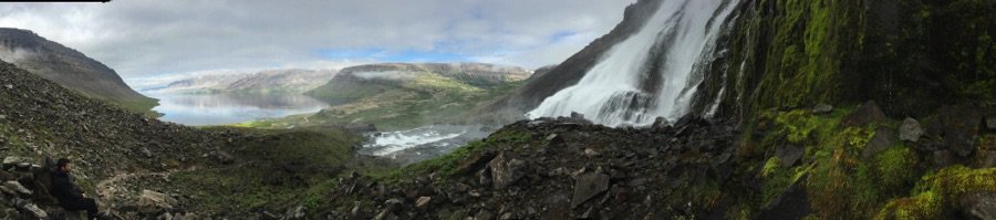 After a being shaken up on the dirt road leading out of the Látrabjarg peninsula, we reached what we thought was Dynjandi Waterfall (Fjallfoss), Iceland’s waterfall poster child. A little further, however, we realized that it was by no means as big as the enthralling and dwarfing real cascade. It’s also possibly the most perfectly formed waterfall, as if someone made a wedding cake for the gods.The dramatic,100m high falls tumbles down a rocky escarpment and as we walked up toward her,we passed a series of smaller falls.You can really get up close to the main attraction and I found yelling in to the roaring falls to be a great stress reliever.