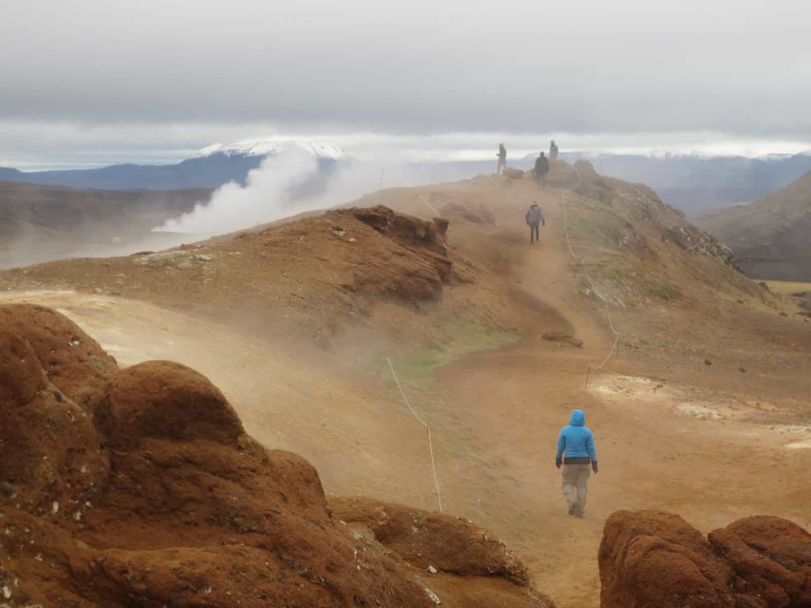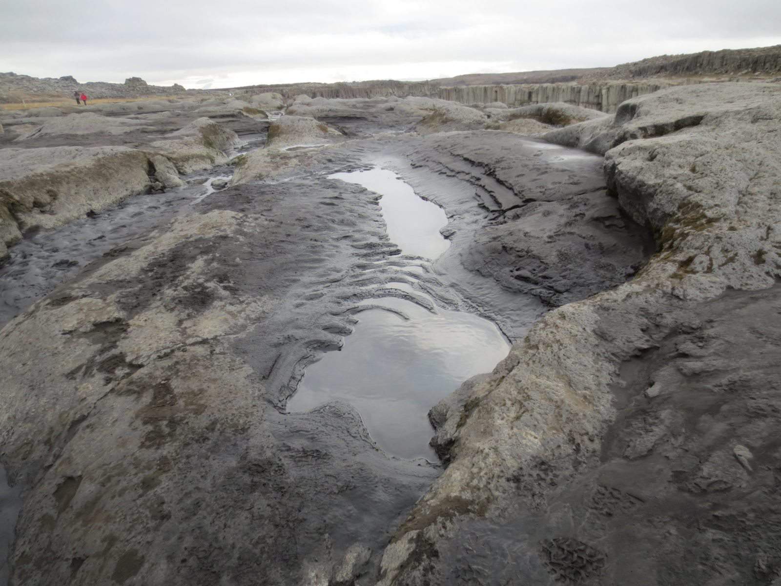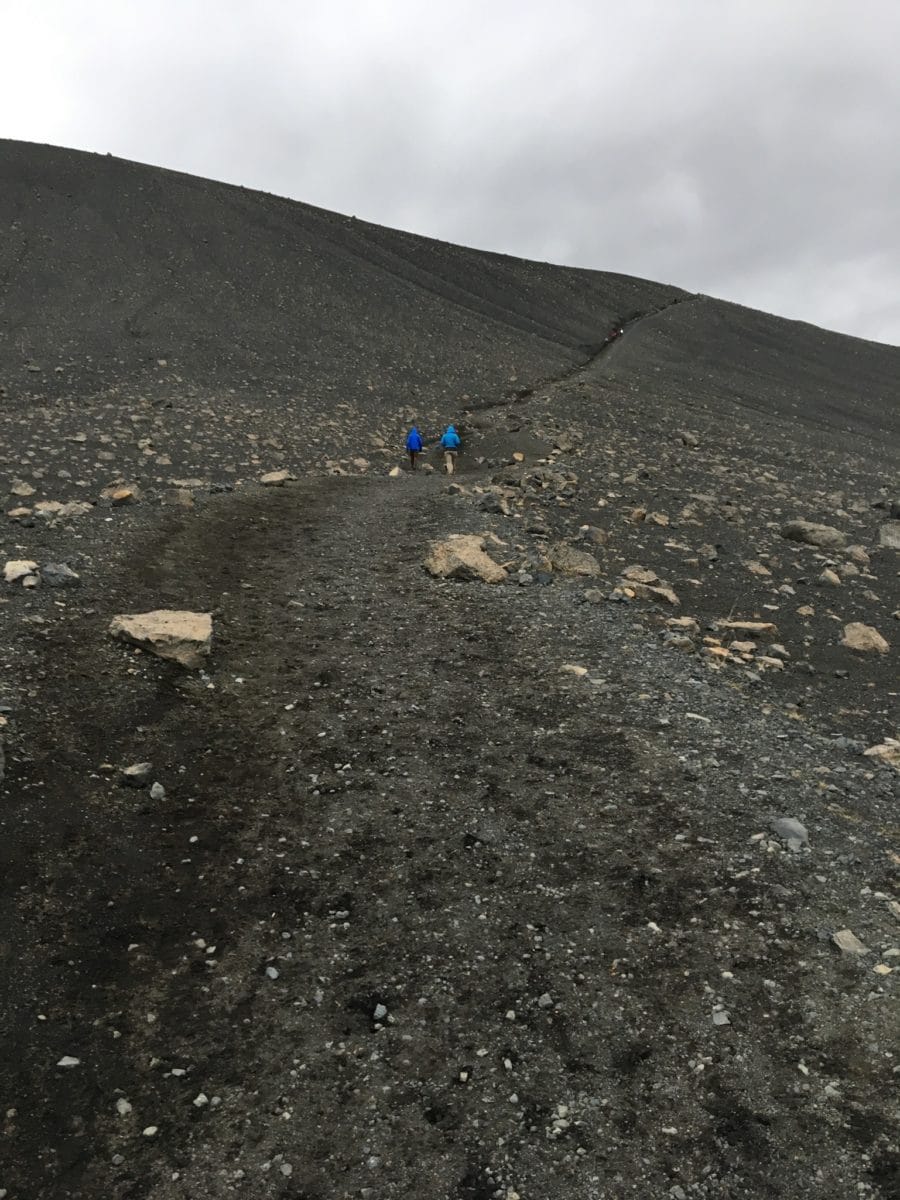Our last stops were Hverfell and Dimmuborgir. Trudging up the massive crater that erupted 2700 years ago is awe inspiring. In the last light of day, we hiked the paths through another lava landscape with towering black rocks set off by white bark trees. It was really interesting to see how lava could take on a completely different form again. As we pulled into Vogar for the evening I thought of today as the day of many colored mud. Our shoes proved it.