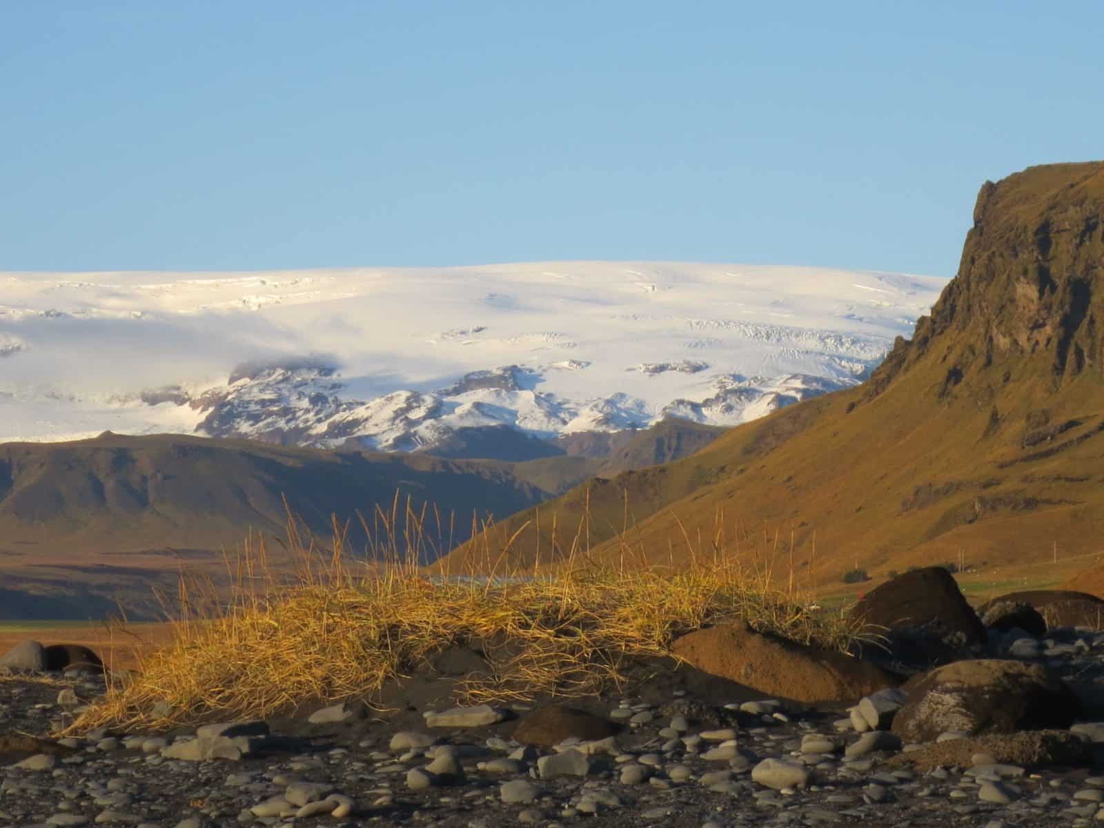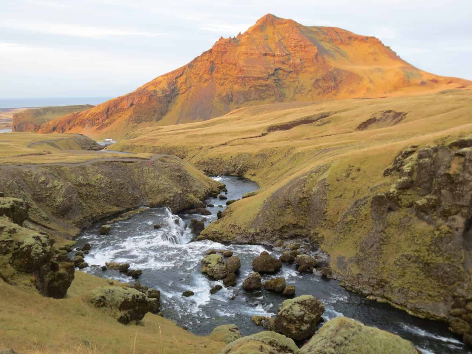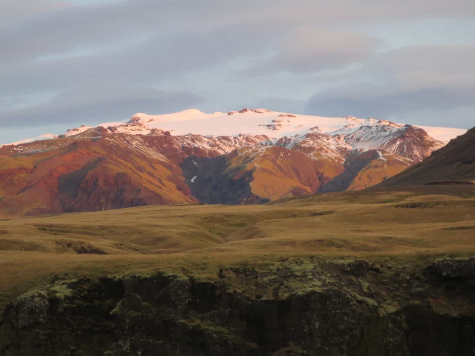 It was fun to view the surroundings from this unique vantage point. I noticed a hiking path and decided to keep going. I walked for almost an hour, on what I later learned to be on one of the most famous hiking trails in all of Iceland, Fimmvörðuháls. As the sun cast its light upon the Mýrdalsjökull glacier, the ice radiated an enchanting pink hue. Against all the other colors of the surrounding landscape it was a sight to behold.