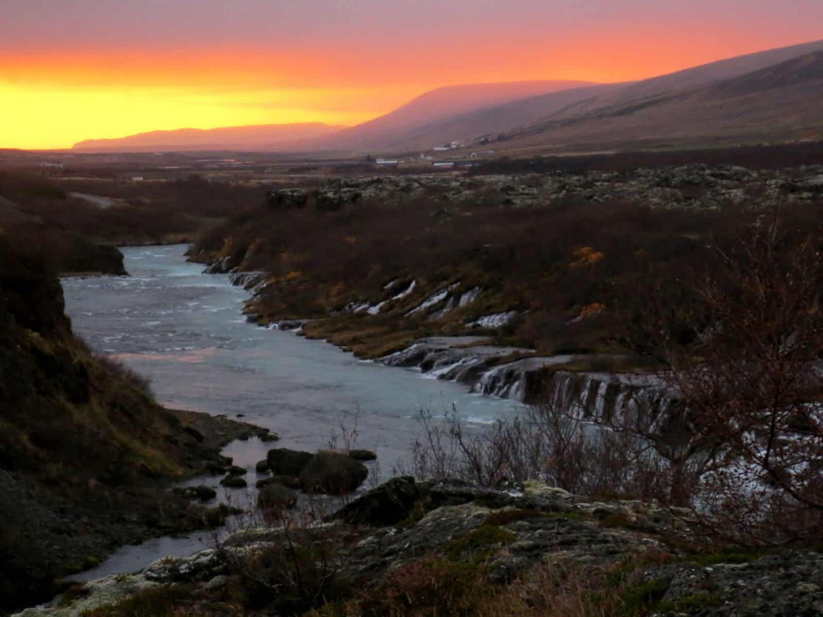 We were longing for a detour and a chance to get out of the car so we drove to Deildartunguhver Thermal Springs. Amazing to think how hot that water is and how far it travels. And then we found Hraunfossar and Barnafoss, the twin turquoise waterfalls. We pulled in just in time for a chilly sunset spectacle. Can’t believe how lucky our timing is sometimes.