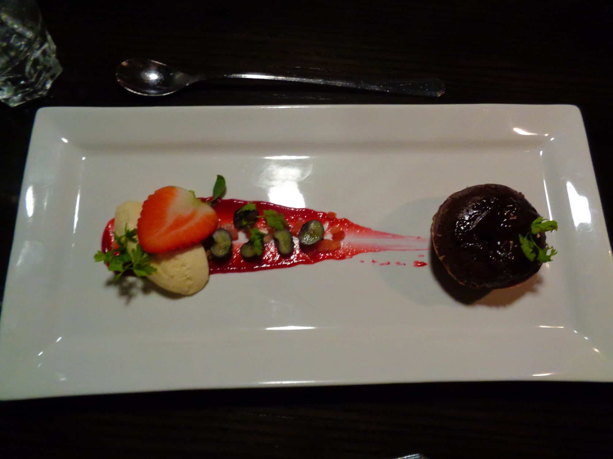 Adam covered the lingering taste of ammonia in his mouth with Arctic Char, before we shared a chocolate and berry dessert.