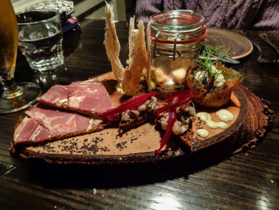 The starry-eyed illusion, with warm candlelight upon our faces, faltered when our shared ‘Icelandic Taste’ starter arrived. This included lamb on rye (yum), wind dried fish (a bit weird, but okay), and… Hákarl.
