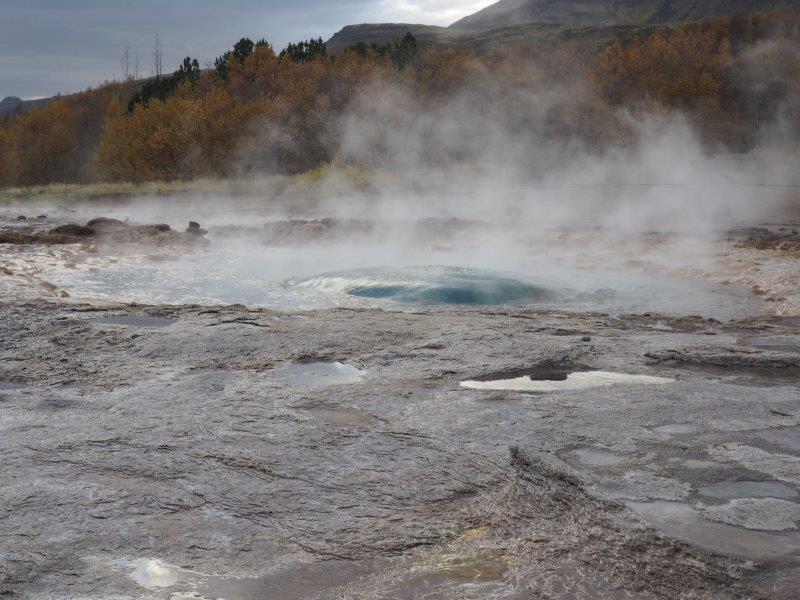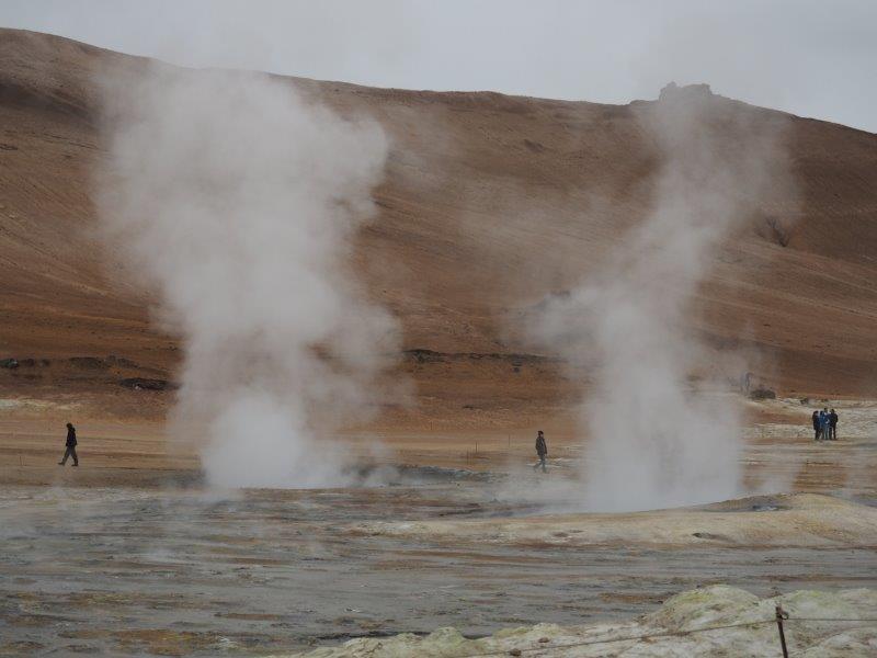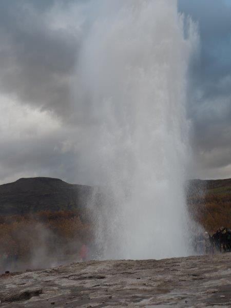 Out of the wind and back into our camper and off to the next stop on the list – Geysir. This is the famous geothermal area with geysirs of spouting water. It was amazing to see the steam literally rising out of the ground. We didn’t see The Great Geysir ‘erupt’ (apparently it’s activity has lessened over the years) but Strokkur bubbled then spurted water three or four times while we were exploring the area. We stayed upwind – it was too cold and windy for Julie and I to want to get wet, though we saw a few others get drenched.