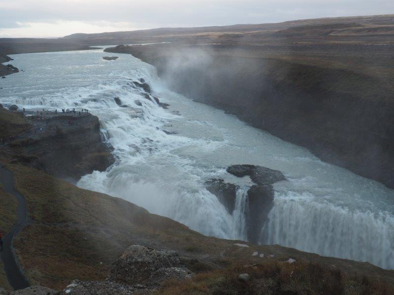 It was getting late in the evening but we decided to push on to Gullfoss, hoping to catch the waterfall in the last rays of sunshine. Although the light was fading we could clearly see the gushing water and two cascades that makes this waterfall one of Iceland’s most beautiful (though I think being the judge of that would be difficult!).