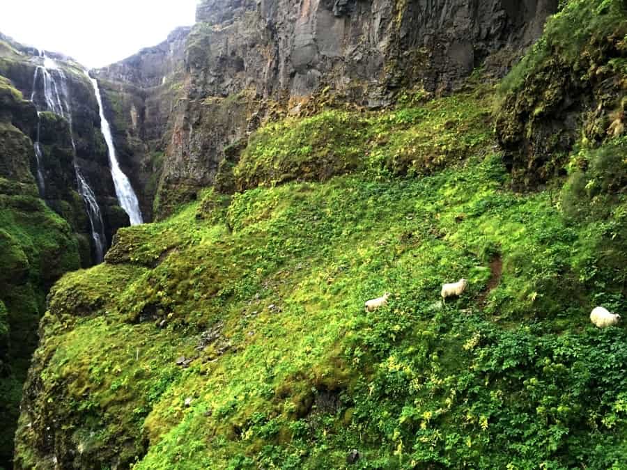 We ended up at the entrance to the trail to Glymur, a waterfall we had both heard about but didn’t think we would get to see. A gorgeous hike through a verdant canyon ended in a 198-meter waterfall (the highest in Iceland) flowing into the river below. Rounding the final bend, we stumbled upon a quintessential Icelandic scene—three sheep grazing on the cliffs next to the falls.