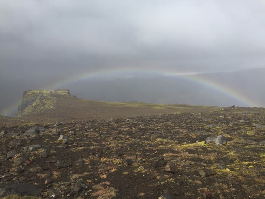 Finally, after twenty kilometers of climbing, the trail began to even out and gradually descend. The rain and hail let up, and the ice on the ground diminished. We picked up our heads and through the gray saw the first splash of color since that morning: fluorescent dotting the moon-like landscape and the hint of a rainbow. As we closed in, the sun brightened and a full arc emerged, framing the trail and marking our path out of the glacier.