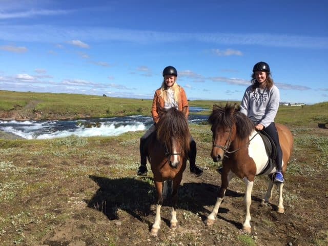 No trip to Iceland without getting in touch with some horses. Scared and anxious we went to the horse rental place where the two nice tour guides welcomed us. They calmed us and gave us the calm horses, and as the riding tour began we forgot about our anxiety. Riding in tölt the tour guides took us through plants and beautiful purple flowers, crossing streams and we had a break by a waterfall. Views of the volcanoes Eyjafjallajökull and Hekla were in the background during the whole tour.