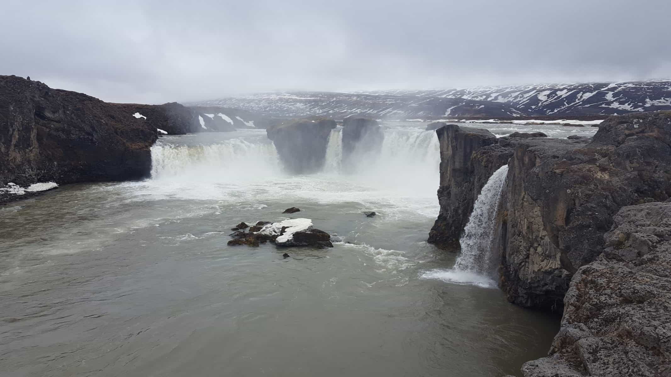 The next sight we wanted to see was Goðafoss, which isn’t too far from Akureyri, so that’s where we went. The waterfall is magnificent, so large, so much water. It’s unbelievable how close you can get. After enjoying that view for a while we walked along the path next to the river towards the bridge that crosses it and then the path on the other side that leads to the lookout point. There you’re not as close to the fall, but you do get a great view of the whole waterfall.