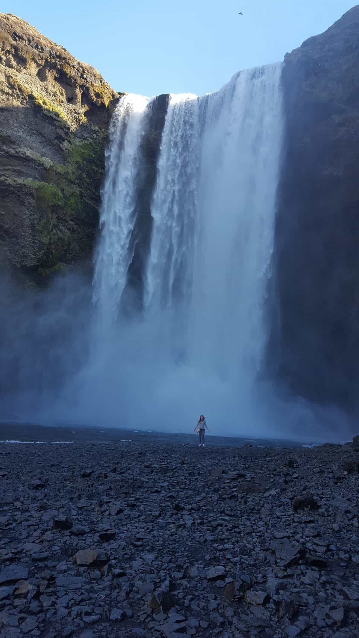The next morning bright and early we went to Skógafoss. This waterfall can be seen from the ground and from the top. Obviously, it involves climbing to get to the top, so we were glad it was still early. There weren’t many people and the sun was comfortable but not too warm yet. At the bottom of the fall, you can get very close to it. You do get a little wet, but it makes for nice pictures where you can also see how big it really is.