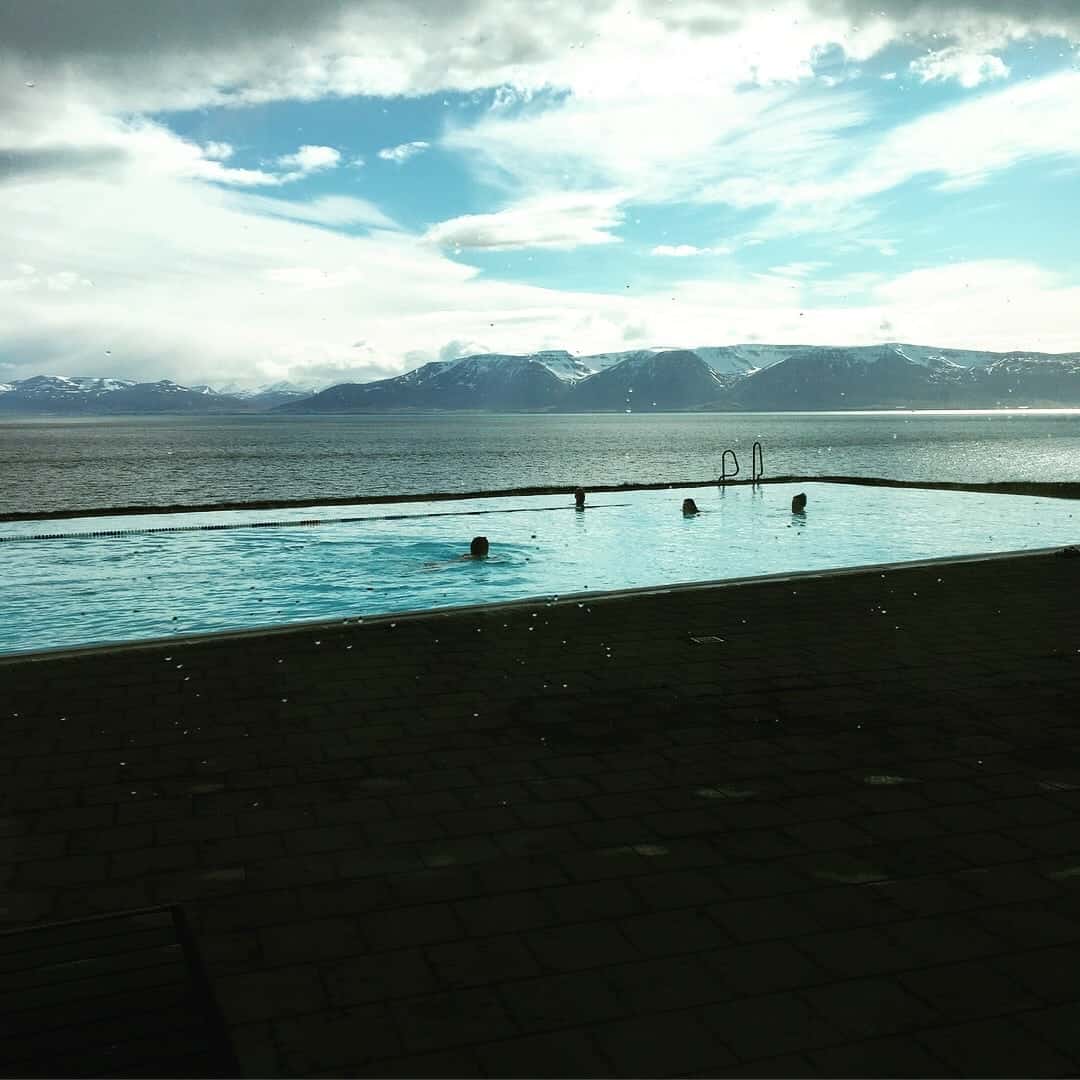 The next detour was Hofsós, which has the most luxurious local swimming pool—the best $9 we ever spent! The infinity pool overlooks the fjord with breathtaking views. We continued up around the peninsula, stopping for a picture and a primal scream into the arctic void at the northernmost point of our drive: Tröllaskagi.