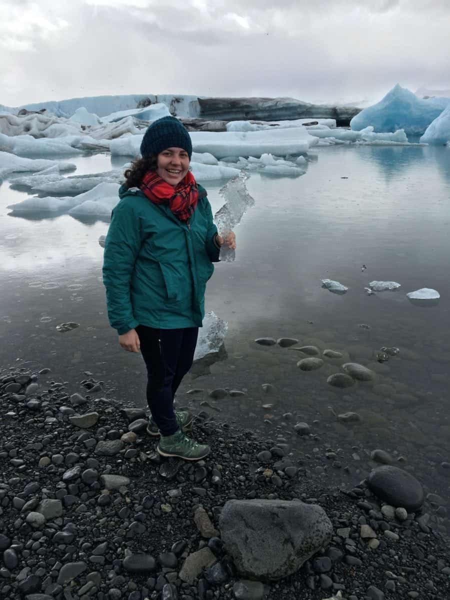 Emily holding part of a glacier at Jökusárlón & Dani sitting on a glacier at diamond beach