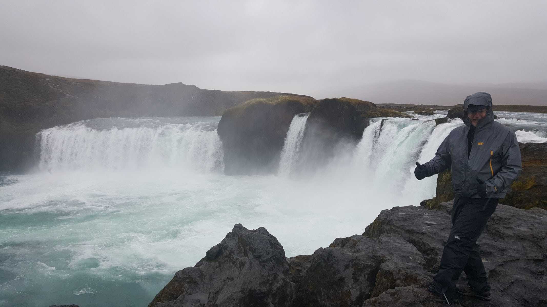 Day 5 – Fire and Ice come together to make waterfalls (foss). We hike past Goðafoss waterfall in the rain before driving through fantastic lava fields to a second magnificent waterfall hike of Dettifoss. Rain shells are a good idea!!