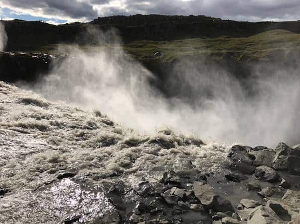 The owner there gave us tips for things to do on our last two days of the ring road, so we set off for Dettifoss in the north. This is another raging waterfall, but unlike the white waters of Gullfoss, this one is tinged by black silt. You can walk on the rocks right up to the fall-off point. Very raw and impressive. There’s a 28-km bumpety bump gravel road across a dry, dusty plain to get there from the ring road.