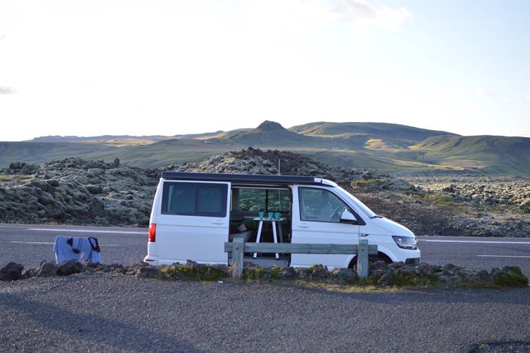 We started in Reykjavik, where we collected the 4×4 VW California van at the airport and got a thorough explanation of how everything inside works. Then we set off. The first day we intended to go easy, so we went shopping for food as our first outing, getting what we’d need for breakfast, lunch and dinner for a week on the road. Pasta, bread, cheese, potatoes, eggs, cucumbers, coleslaw, grapes, etc. and cookies! I’d read a blog about the importance of road snacks. Anyway, no hotels, no set meals, no fixed schedules – the thought of it all was liberating. Total flexibility.