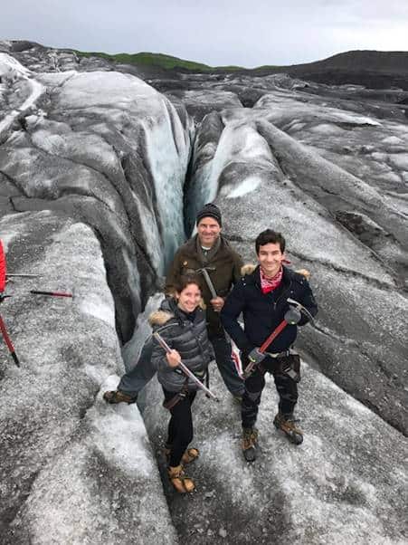 This was on the way from the Golden Circle to Skaftafell, the most accessible point to the large glacier at the center of Iceland. We settled at the campsite right at the foot of the glacier and decided to take the guided glacier walk in the morning. This was not cheap for the three of us, but what a thrill – another must-do. Our guide was fantastic, we learned a lot and got cold, yes, even in August. From there we stopped a little way down the ring road at another lagoon, this one with icebergs floating in it. We kept our bodies out of this one but I froze my hand holding an ice block for the photo op below! Makes again for unforgettable images and incredible pictures.