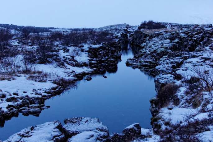 The rustic weather conditions created an atmosphere rather unique. Cliffs cloaked with spots of white snow and black volcanic rock, overlooking the largest lake in Iceland: Thingvallavatn (Þingvallavatn). A slight breeze carried snow through the valley of the park, all the way to a dormant and calm Thingvallavatn.