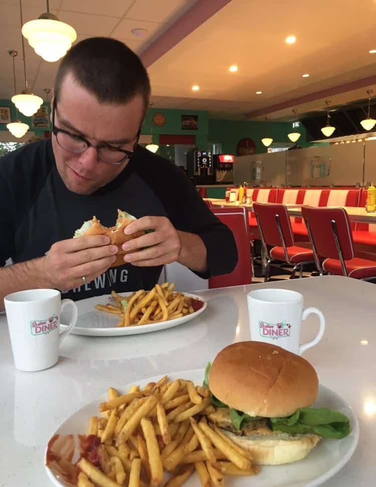 At this point, we had been driving for a long time and we were getting very hungry and cranky. I fell asleep and Murray woke me up a while later in front of a 60’s style diner (which after a few minutes we realized had a separate menu in English, thank goodness)! We enjoyed a delicious burger and fries, quite a treat after 4 days of pasta and canned soup for dinner. We also treated ourselves to Oreo ice cream in a waffle cone!