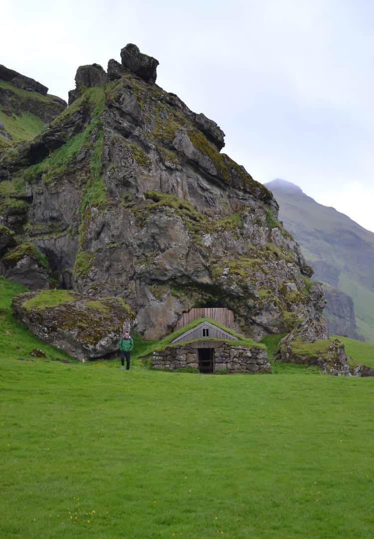 Today we woke up at 01:00 PM (oops, jet lag got the best of us) and realized that we slept beside a really cute grass-roofed shelter that was previously used by houses nearby as a place for the milkman to store the milk so that it was out of the sun or cold while waiting for the people to pick it up! We headed for our first stop, Skógafoss waterfall! It was an incredibly powerful waterfall and after waking up and making breakfast in the pouring rain, it was very nice to have the sun come out briefly to greet us. On the way to the waterfall we stopped at at the Rútshellir caves, which were very dark and spooky.