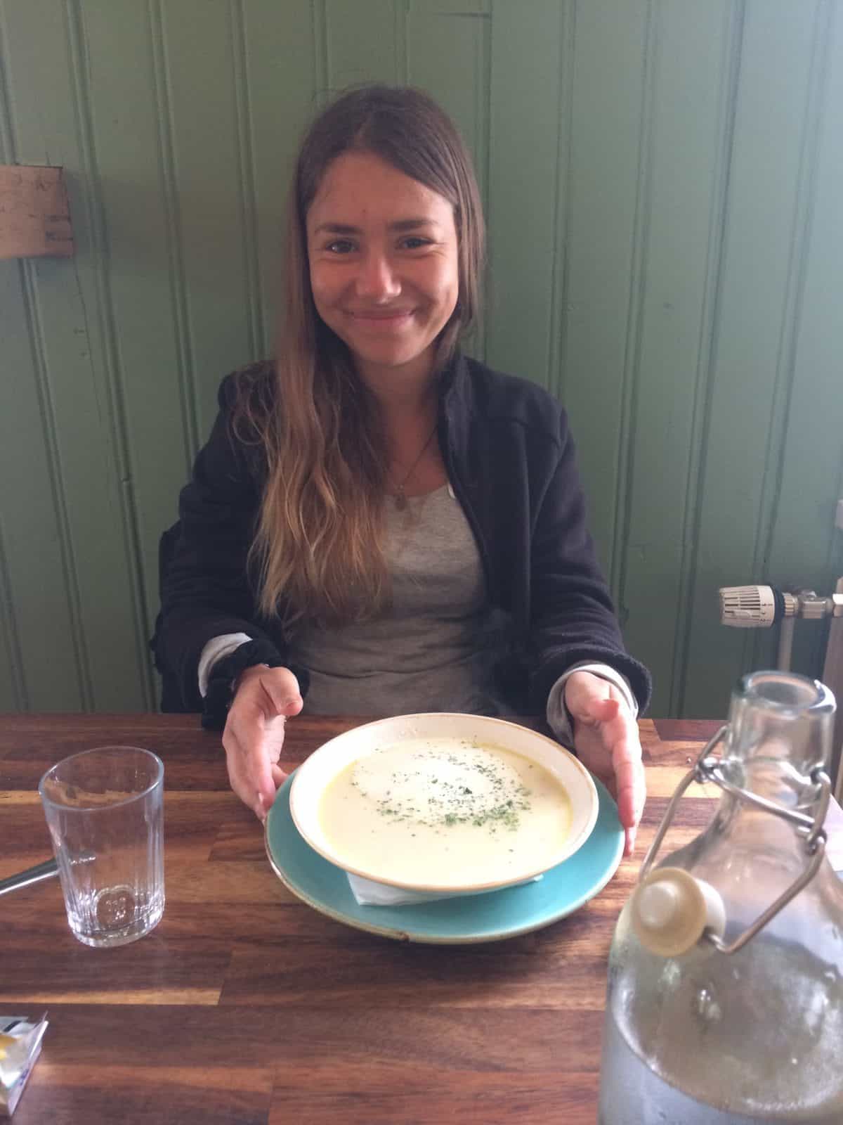 The wood on walls, the smell of Icelandic cuisine and the laugh of the Asian tourists on the table behind us will make us remember this lunch for a while. A very nice waitress came with the menu and took our order. We choose soup, shrimp salad, and a Pizza to share between us two. The food was served very quickly and was excellent. This local restaurant was a very lovely place.