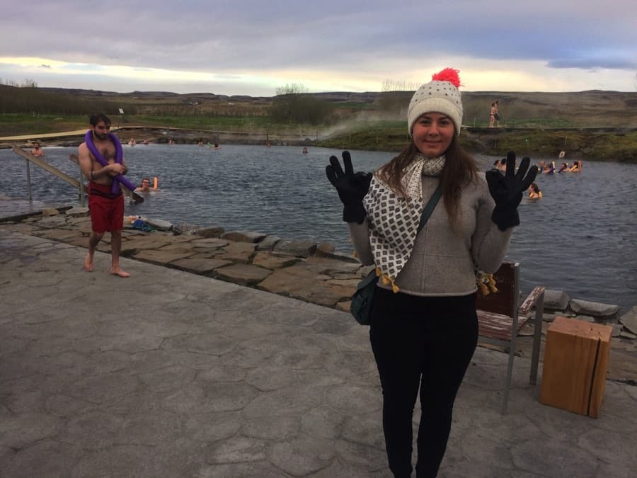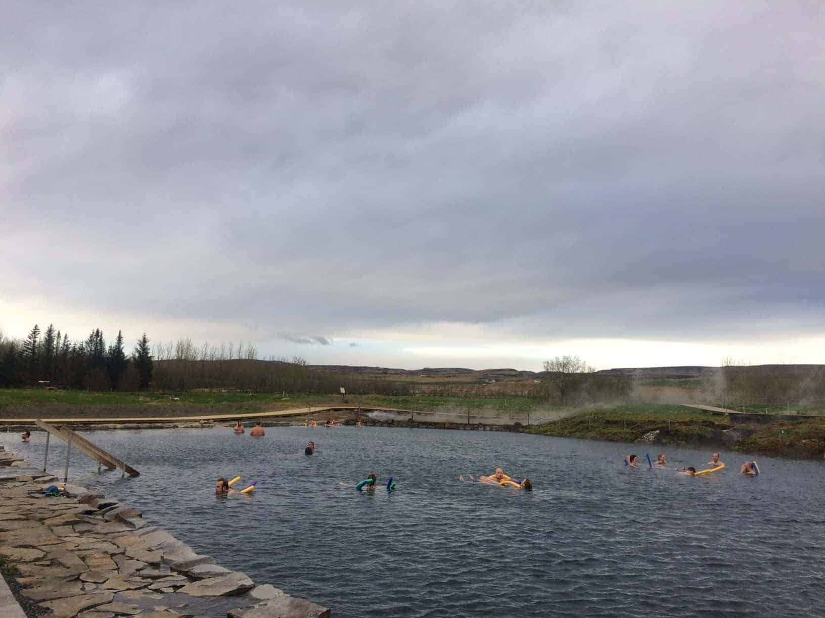 I have been to Japan and absolutely love onsen – hot Japanese natural spring baths, so I spent some time researching a possible hot spring in Iceland. Mr Adventure said the Blue Lagoon was gigantic and a bit commercial, so I came across one called the “Secret lagoon” nearby and we decided to give it a try. My word. HEAVEN! We pulled up near some of the charming greenhouses that are lit by sunlamps in the late evening reminding us of Christmas. The Secret lagoon is wonderful, about $40 each including towel rental and it is so pure you need to shower first. Stepping into the hot spring from the cold fresh air into the spectacularly naturally heated water, feeling our feet on the clean smooth pebbles below was magic. Then some Icelandic horses trotted past. We stayed in for an hour or so. Magic magic magic.