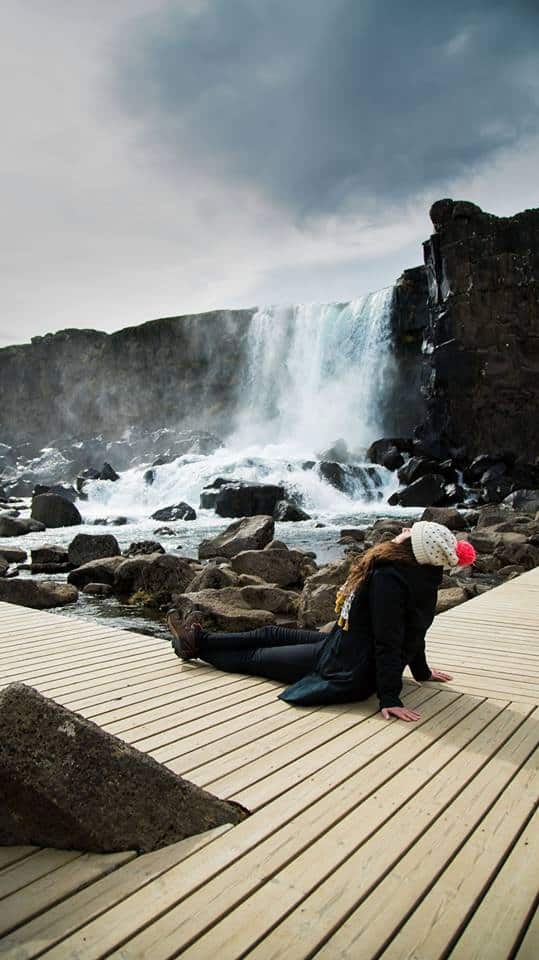 Our first stop was at Þingvellir National Park (note, in Iceland the “Þ’” is a “Th” sound). An interesting history of the first parliaments set on two tectonic plates that shift gradually each year. We made a coffee and ate our expensive gourmet sandwiches and set off to check out a waterfall. It was fantastic, from the moment I saw this waterfall gushing fresh spring water over a ridge I was in love. This land is STUNNING. We ended up doing a whole walk, about 2 – 3 hours looking at the various sites and views and Mr Adventure took a photograph or two.
