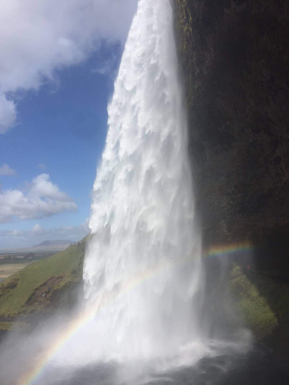 We went to Seljalandsfoss waterfall which is stunning, it was sunny and gorgeous. I said, I don’t think I’ll walk behind it, I just did that in Queensland in the rain forest last month. But then all of a sudden I was leading the way and giggling at the rainbows that appeared in the mist and the water spray that began to soak me. Loved it. Would do again. There were smaller waterfalls, including one in a cave just a short walk along the path.