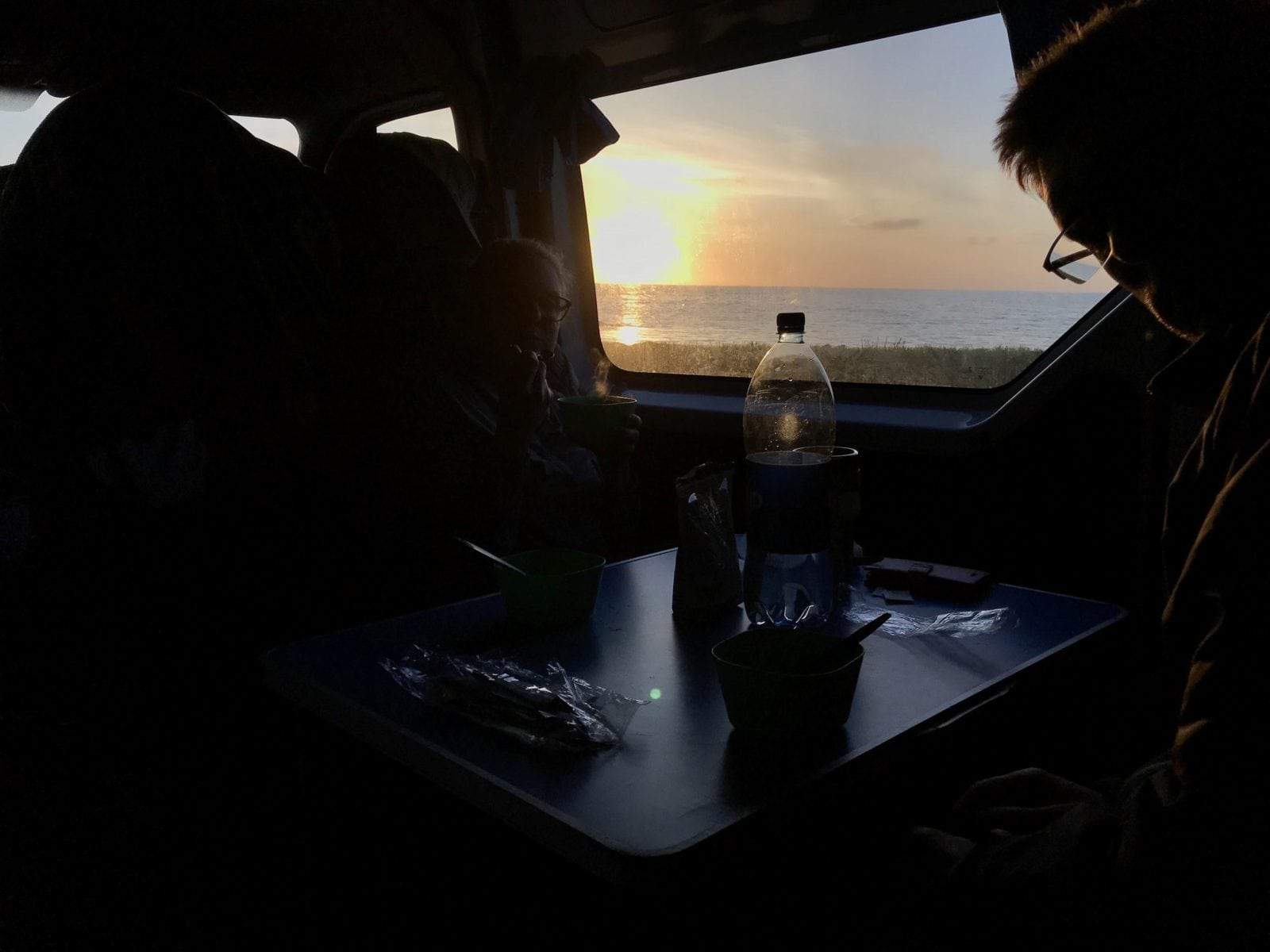 Dinner in the camper van overlooking a gorgeous sunset at Akranes campsite.