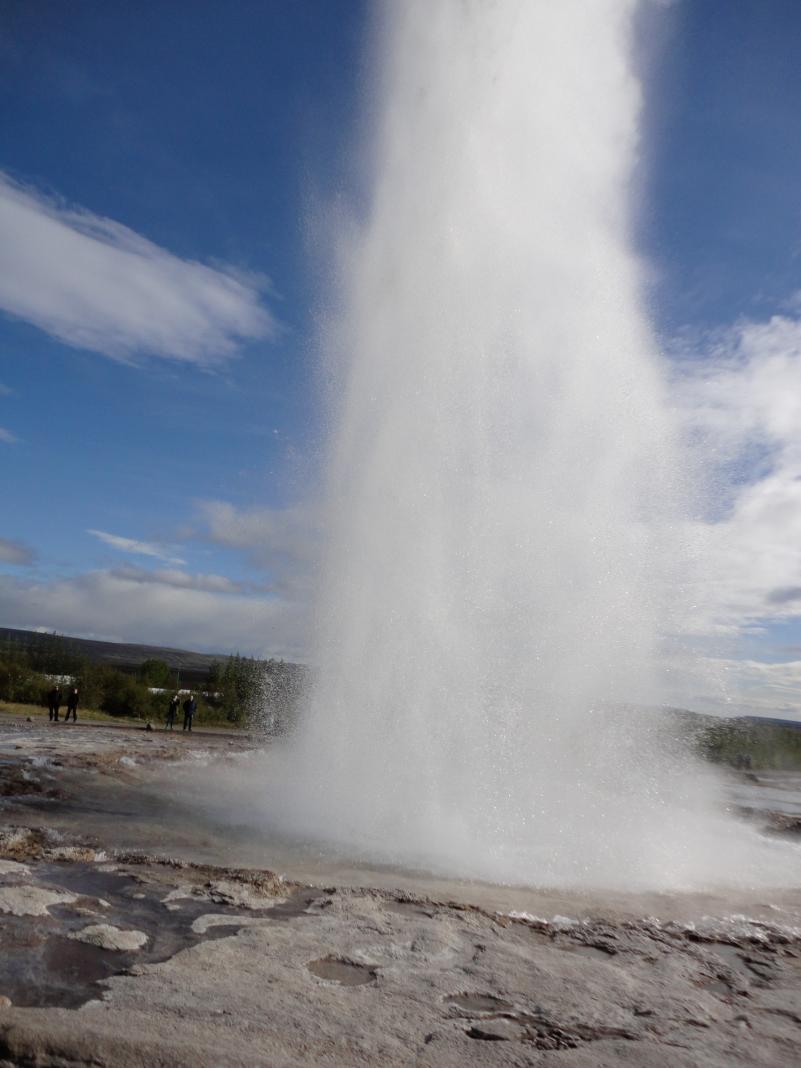 We also went to the geyser Strokkur. I decided first to watch the geyser erupting, but then I jumped in and joined the ride. I was heated up far beneath in the ground. Then I was pushed upwards again as warm aqueous vapour, glancing through the cloche of water right before I was smashed high above in the sky, sailing softly back to earth and landing tender on the shoulder of my guy, standing in the smelly steam. That was fun!