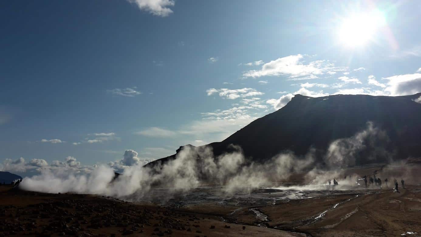 Thus I decided to join them and I will never regret playing with the gases. But just me. I ensured that none of them both ever came too close to these bubbling pots of hot paint or whatever it was. I flew with hot steam into the air, twirling through the sky so much that it was even hard for me to tell, if I was still aqueous vapour down from the earth or if I already mixed up with the white clouds in the air. So I flew with them up to the Námafjall, watching the play of colours from above. I have been a bit smelly when we climbed back into the camper, but the two humans didn’t care. They smelled as well. But I never minded them to be a bit smelly.