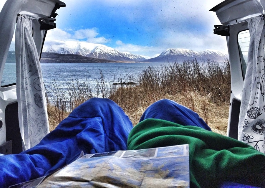 Hauganes – A top spot for campervans. We camped right on the lake here and woke up to a stunning view of snow-capped mountains as our morning view.