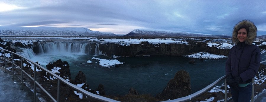 The next morning in the light we found no less than three bus loads of tourists admiring the waterfall. The path had thawed a bit since the night before, and we saw people walking the path behind the falls, although we decided not to ourselves on account of the spray and the ice. I am glad we did most of the driving in the daytime, the journey being the point of the trip, but I am also glad we got that magical moment with the waterfall in the dark.