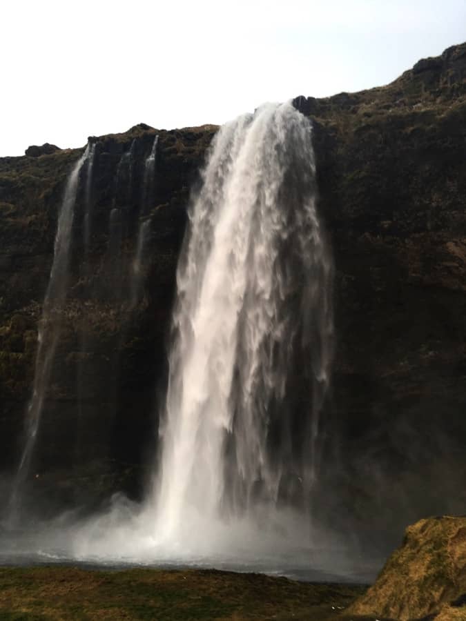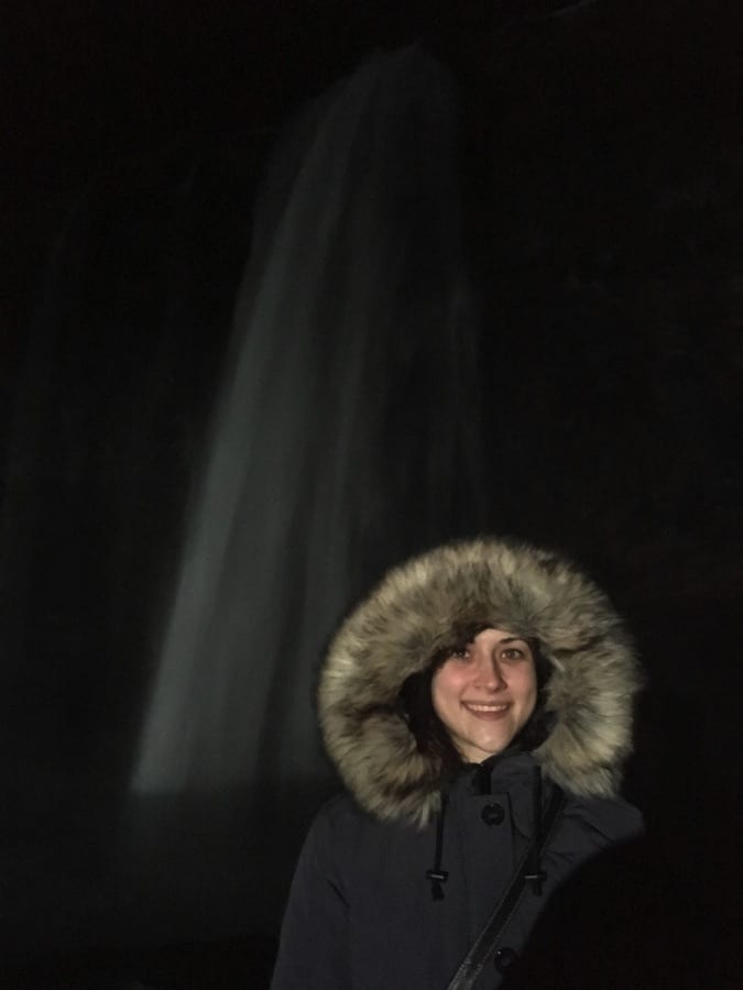 We tried to do most of our driving in daylight during this trip, not wanting to miss anything along the way, but as we left Geysir the sun was setting, and we decided to press on toward Vík, our second destination. We drove for about an hour when on the left, illuminated in the dark, we saw a waterfall probably about 50 meters high. This is what we loved about having the camper van. “Obviously,” we said to each other, “we have to go over there.” So we did. Picking our way slowly and carefully along the icy path we approached the waterfall. It was lit by a huge spotlight pointing up from the ground so that the falling water seemed to glow against the black cliff face. The path took us to the edge of the pool and we stood alone in the icy spray. We decided then to camp near the waterfall, and see it in the morning daylight before continuing on.