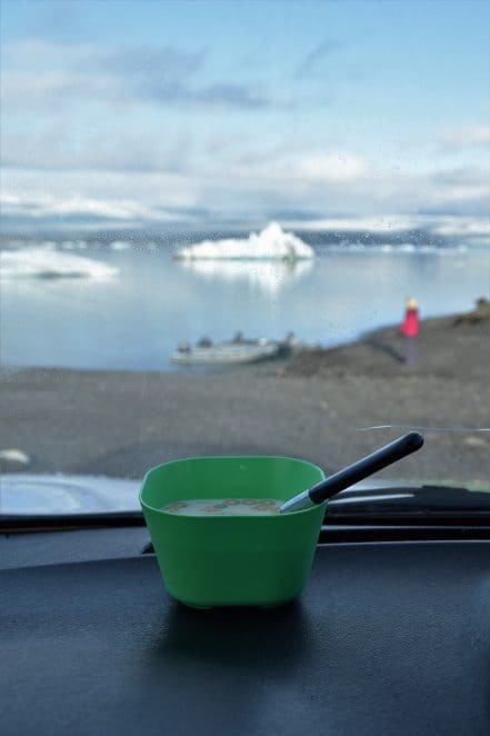 We concluded our beach visit by lunching at the Black beach restaurant. The Kjötsúpa, Icelandic Meat Soup and Turnip Soup were scrumptiously delicious. As we were settling inside our vans for the power nap by the parking lot of black beach, we could hear the howl of the growing windstorm. Next we headed to a campsite at Kirkjubæjarklaustur for the night. It was a comfortable stay and we used the stove to make some Indian food -Dal and Roti. We were accompanied by interesting folks from Singapore and whiled away time playing cards.
