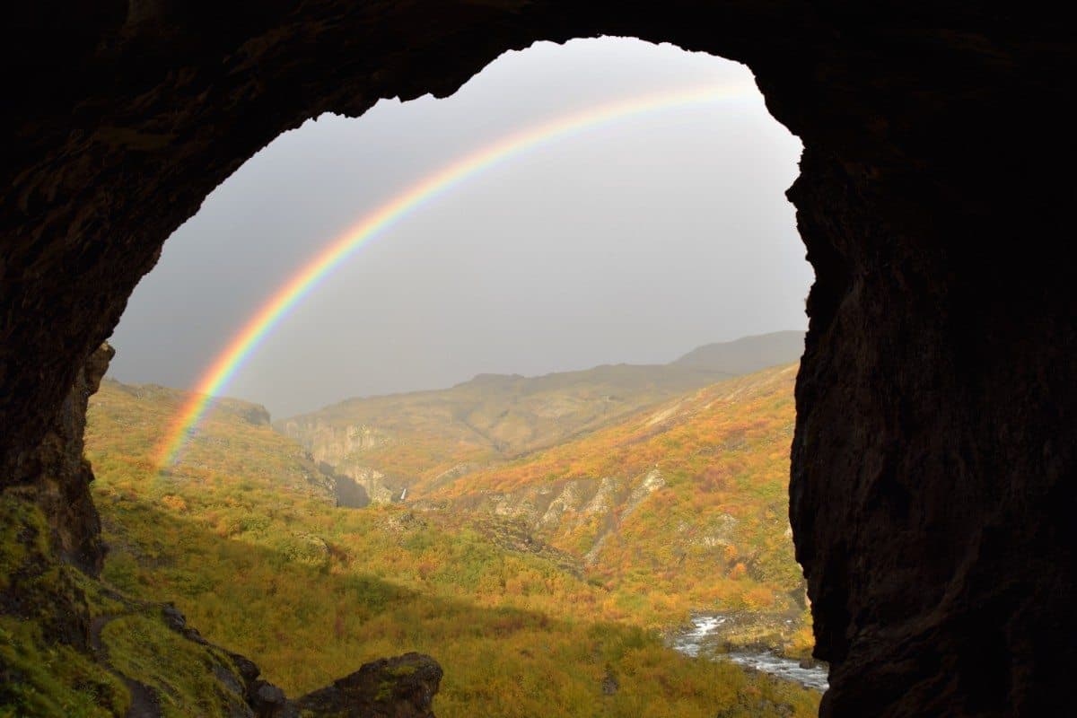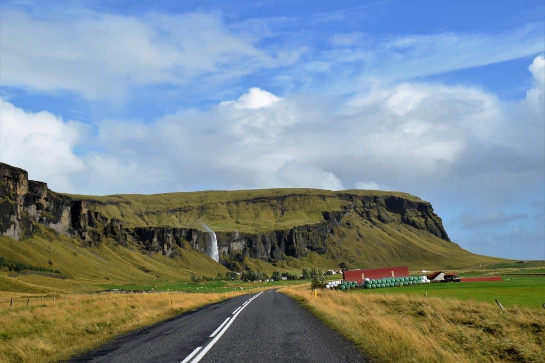 Though the road this far had taken us past quite a few waterfalls, our excitement for the next one, Seljalandfoss, grew by the minute which is famous for view from behind the tall majestic falls. The day ended with a shimmering rainbow across the fall and us camping on a bay overlooking a farm nearby for the night.