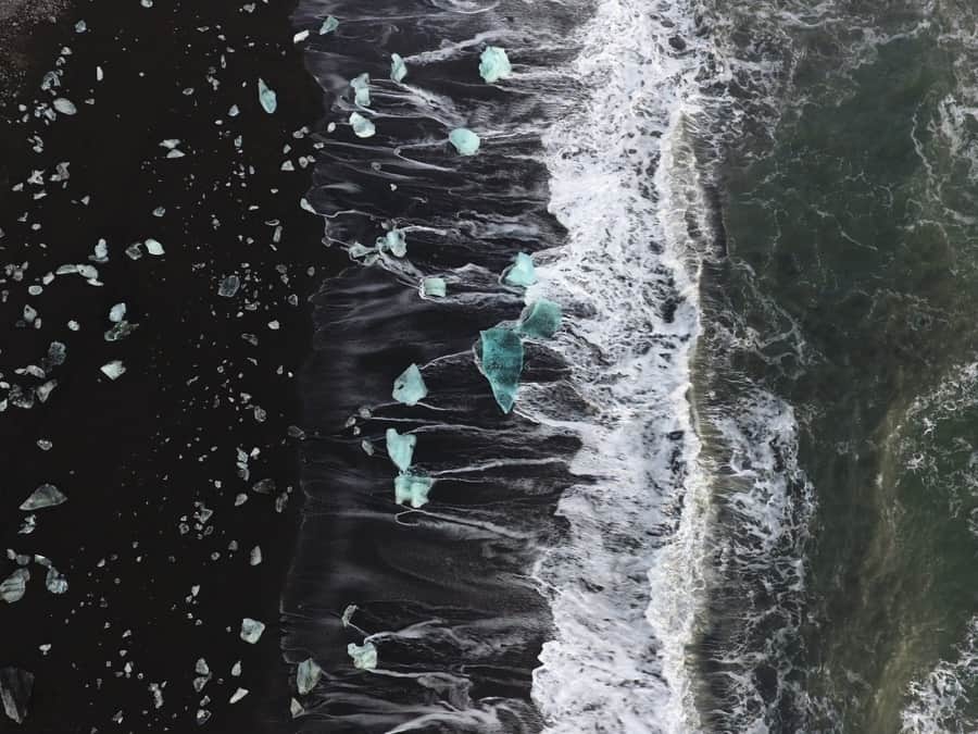 Right off of Route 1, the lagoon is full of jagged bobbing chunks of glacier that have floated down toward the ocean from the Jökulsárlón Glacier. At first glance, the glacier chunks appear statuesque, standing completely still in the freezing water. The more time we spent on the shoreline, the more we noticed the giant glacier pieces would sway and move in the water. While we marveled on the shoreline, at our feet were tiny pieces of glacier ice that looked as if someone scattered shattered glass near the water.