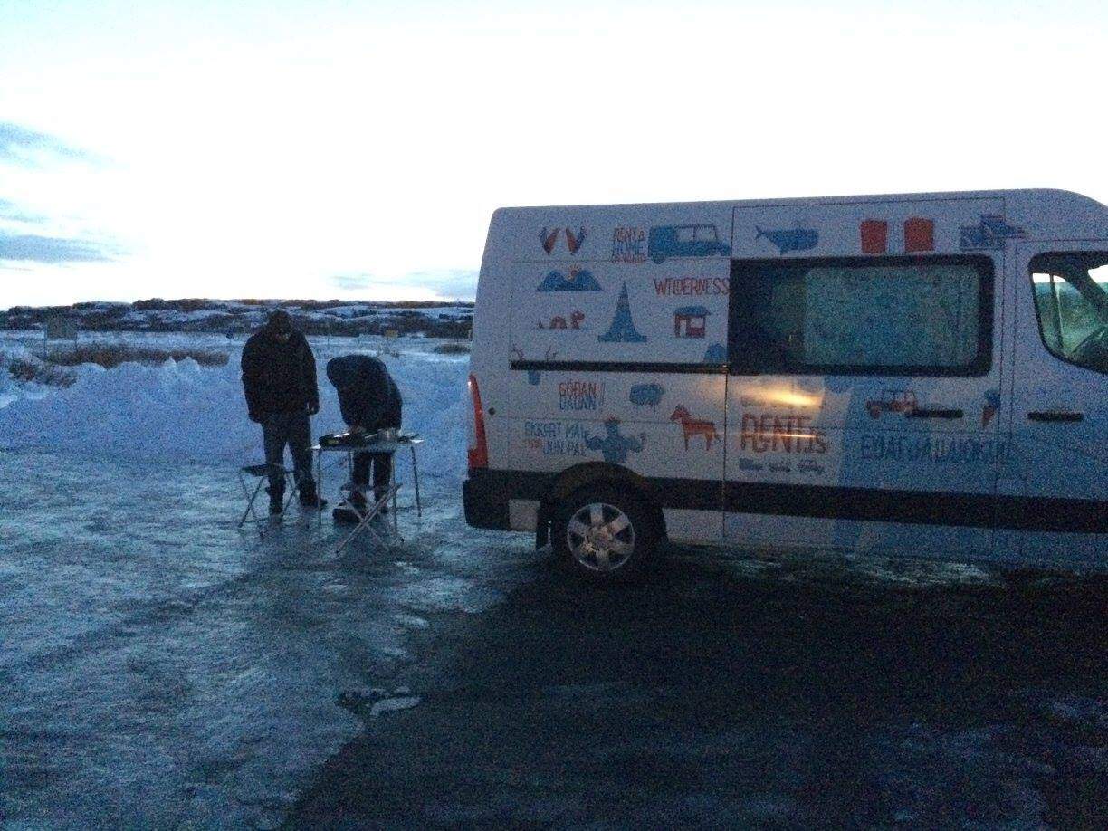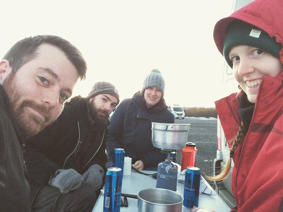 After getting back to our van we head off for Þingvellir to camp for the night. We got there just as the sun was setting, parked at the visitor center where we would camp for the night, and took it all in – we are sleeping among mountains and the meeting of continental plates! Þingvellir had heated washrooms and showers, which were well used by us as the temperature dropped to -14 degrees Celsius in the night. After making dinner on our camp burner, we huddled up with some blankets to watch the Northern Lights as they put on a little show. Our first viewing! It was great.