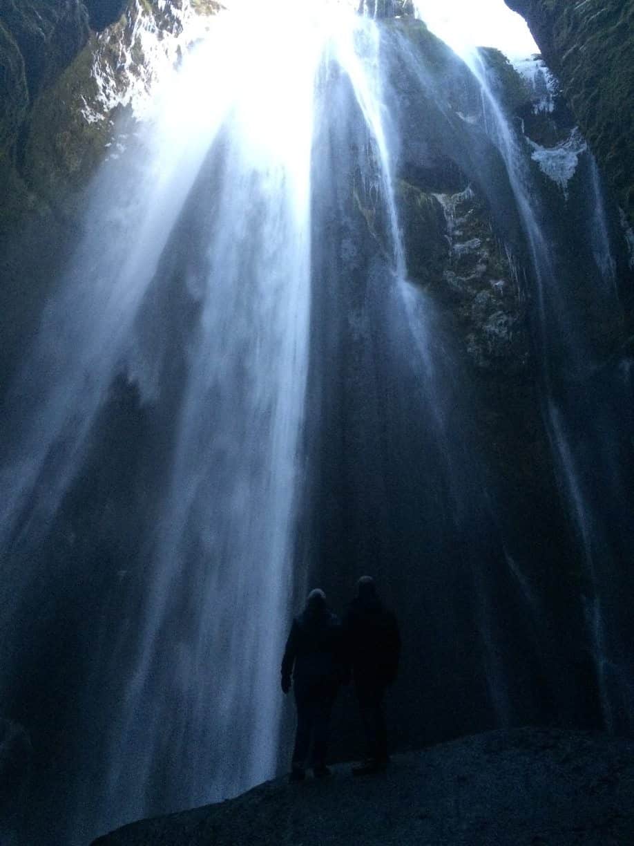 Literally 150 metres from a cliff face with waterfalls. We hiked inside the waterfall Gljúfrabúi and had the most spectacular experience with the water rushing down right in front of us.