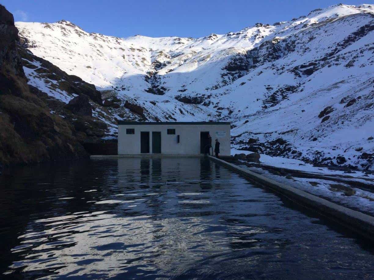 We changed into dry clothes and continued on to the secret hot spring, eventually driving down a really bumpy road! If we had a 4WD camper, it probably would have been ok, but in a 2WD camper van it was a bit treacherous. After spotting a pothole the size of our van, we decided to park a little ways up the road from where all the other cars had gone (those daredevils!). We hiked to the hot spring which is situated between mountains and rock walls, right beside a beautiful river. It was not as warm as the one in Flúðir but you definitely couldn’t beat the view!