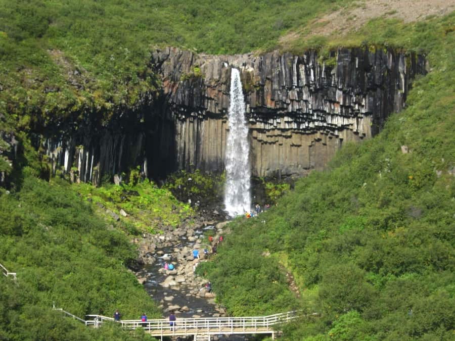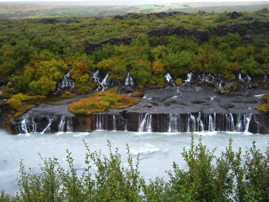 That morning it was raining and we went to Hvitserkur, a big structure in the sea, near the beach, with very curious shape. We saw it very quickly, trying our best not to get wet. After this, we went to Hraunfossar and Barnafoss. We waited in the camper until it stopped raining, and when we could, we saw this waterfall that is short and spans the river bank. The water of the river seems white and is surrounded by green, brown and orange vegetation, the combination of the colors made it different to the others, we liked this.