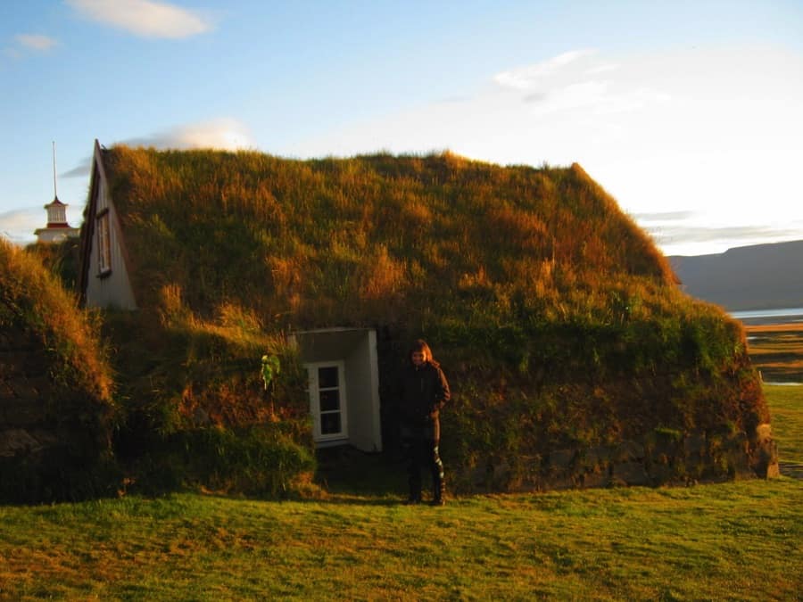 Another day had past and we were still anxious to visit more places. We stayed in Akureyri. There we discovered a swimming-pool that is great. In Iceland the pools are open all year, because they have hot water, with different temperatures. Before entering the pool you had to take a shower with soap, this is a very good option for people travelling in camper vans that don’t have a shower. It’s great as they are not expensive and when it is cold or raining it is very comfortable. In Akureyri we tried the best fish and chips that we have ever tasted. The fish was very fresh and juicy. They fished every day. Near Akureyri, there was a village where you could see the Icelandic typical houses, with grass roofs.