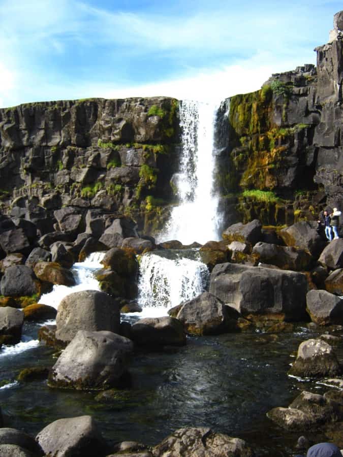 With a full stomach, we went to Þingvellir. In this place you can leave the camper van at a parking lot and walk for about an hour through the crack of tectonic plates. It is exciting because I could imagine how these plates collided. There was a beautiful waterfall and the hike was very wonderful and easy to do.