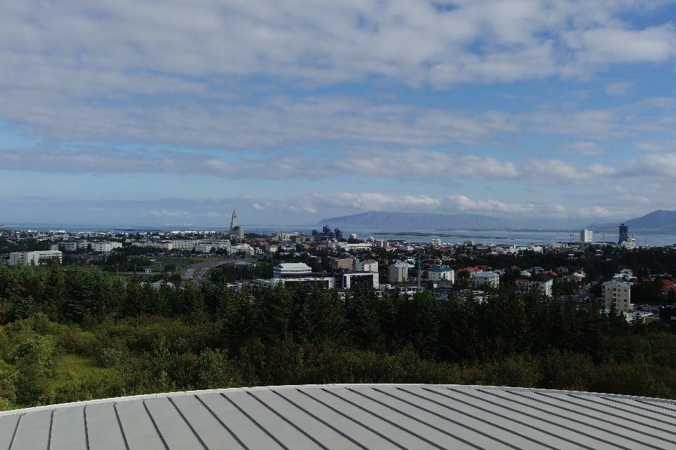 After getting a great night of sleep, we woke up early feeling refreshed and ready to hit the road. We made a couple quick stops before leaving Reykjavik. The first was at a bakery for coffee and breakfast (the bread was fresh out of the oven…delicious!) and then we made a quick stop at Perlan, a gorgeous building and famous restaurant that’s a little bit outside of the downtown area of the city. We had driven past it on our way into Reykjavik the day before and wanted to see it before we were on our way. Of course, not much was going on at 9 in the morning, but we were able to look around and get a great view from the balcony.