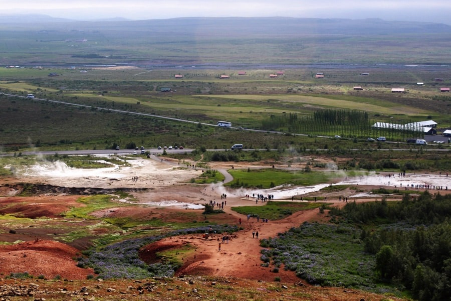 The Golden Circle was our plan for the second day in Iceland. After our homemade breakfast, we left the campsite early and headed straight for Geyser. The weather was terrific for viewing the landscape on the drive. There were lakes, creeks, and mountains that we passed on our way. We pulled up to Geyser and checked out the shop and information center. The clothing was beautiful but expensive. We hiked up to the geyser just as it exploded into the air. Everyone clapped. We proceeded to the tops of the highest peak along with others who wanted a spectacular view of the area. We decided to hike along the top ridge then down the other side of the mountain. We were the only ones who decided to do this and were alone on the mountainside to take in the views.