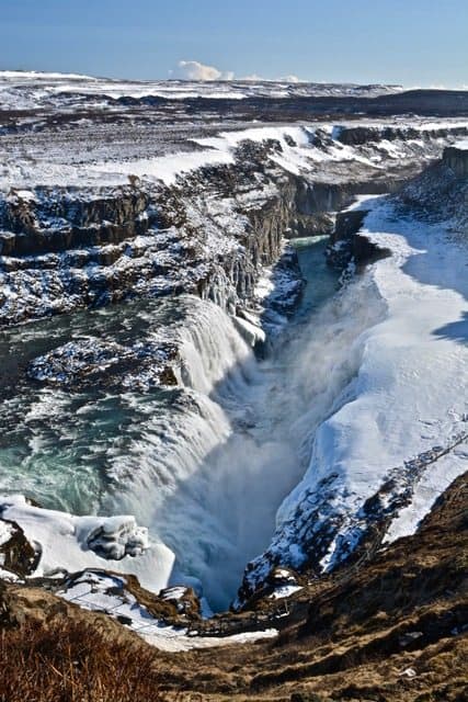 As we made our way along the Golden Circle we came to Gullfoss. To say this waterfall is powerful is an understatement. The crashing of the water over the ledge ricochets through your body and is so loud in addition to the high winds that it can be deafening. Its truly a site to behold and definitely commands your attention. Unfortunately, the path down to get up close to the falls were closed off due to the snow and ice but we could still walk the upper portion of the cliff which provided another spectacular perspective.
