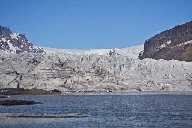 After we made our winding way down from Svartifoss we headed east from the parking lot and walked the much flatter trail to the Skaftafellsjökull glacier. You can see this looming giant from a great distance but as you walk the 5km easy trail closer you really start to appreciate its enormous size. The trail ends once you arrive to the lake at the base of the glacier and you can take in the gorgeous view of this glacier tongue. As you look up you notice all the bright blue ice, black ash, enormous crevices, and can really appreciate how this giant has carved its way through the mountain surrounding it.