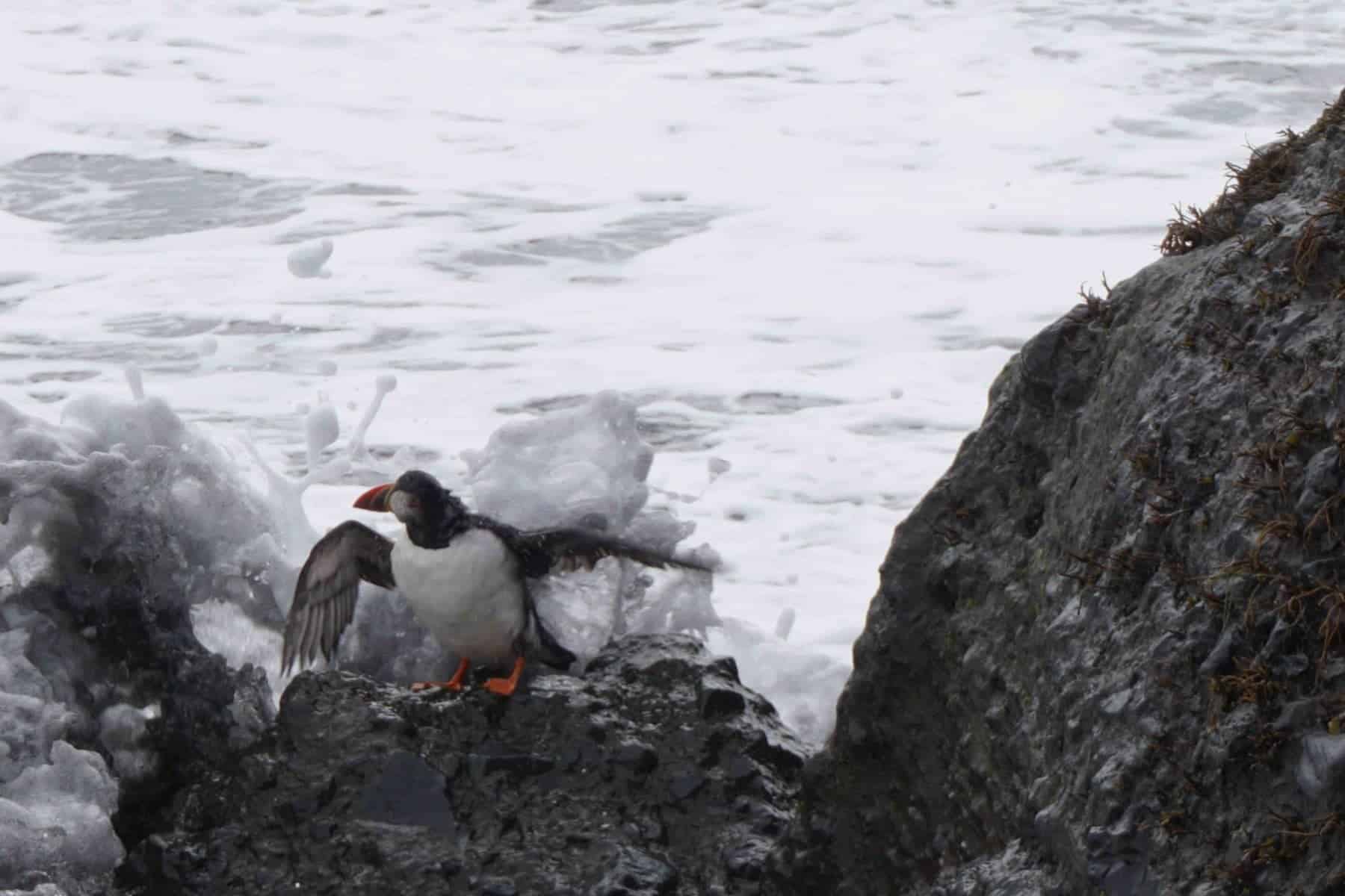 In the south-western part we were lucky to meet some of the cute Puffins at the black beach in Reynisfjara, which is close to Vik. One of them was sitting on a rock where he was washed down by the waves of the ocean several times, but he always dried his wings and got up again. That is a little bit like me. I always get wet and dirty, when I am playing close to water, but until the next time I am always clean and dry again.