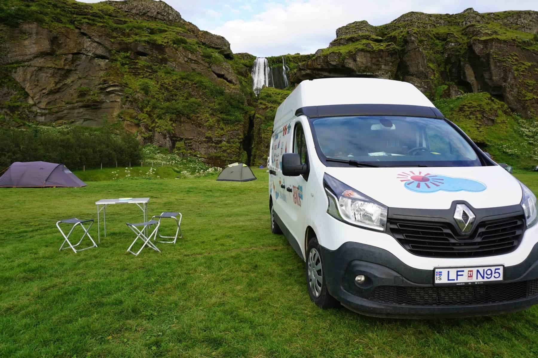 For the night we found a very nice campground next to the Gljúfrabúi waterfall. Parking our camper in the right direction we could see and listen to the waterfall when lying in our bed. It is just a 500 meter walk from there to Seljalandsfoss, a waterfall where you can walk behind (and get wet).
