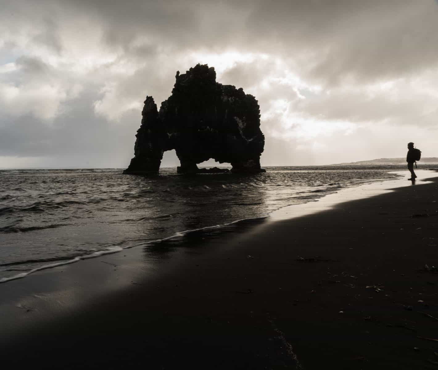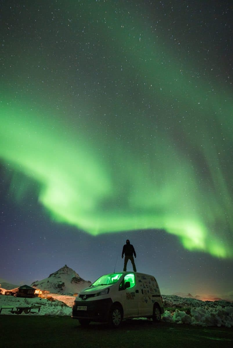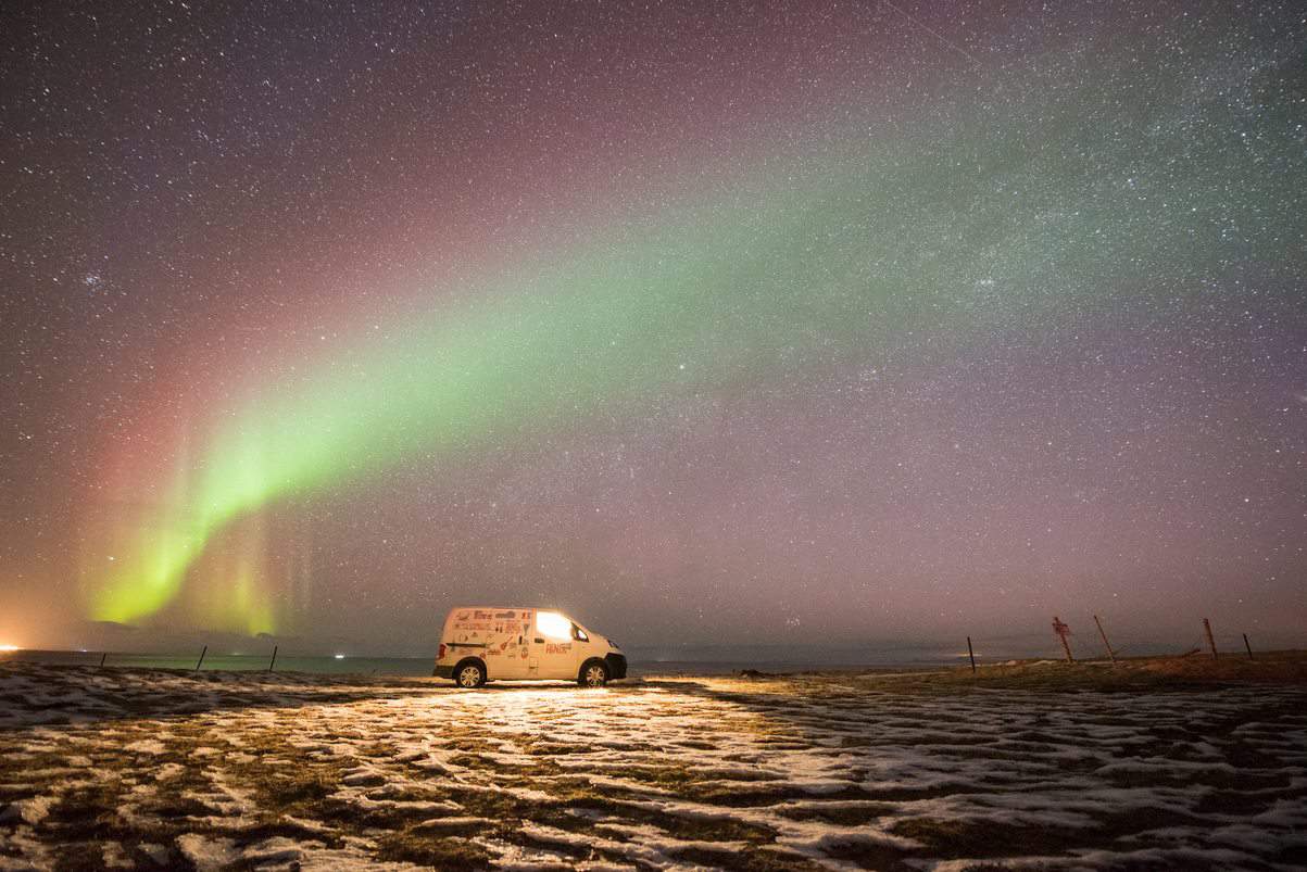 Woke up on the ocean in Hellnar, watching the seagulls fly in and out of the arches that covered the rugged coastline. We enjoyed the sunny morning along the ocean and then drove to Búðakirkja, an black wooden church dating back to the 19th century. We relaxed here until the sunset and then drove north over the mountain pass on 54 to Grundarfjörđur. Pulling into the parking lot for Kirkjufell, we found a line of photographers and spectators eagerly awaiting a chance to see the Aurora grace the skies again that night. Once we had successfully captured the shot we hoped for, we went back to the beach from the previous day and slept here as the aurora continued to put on a show.