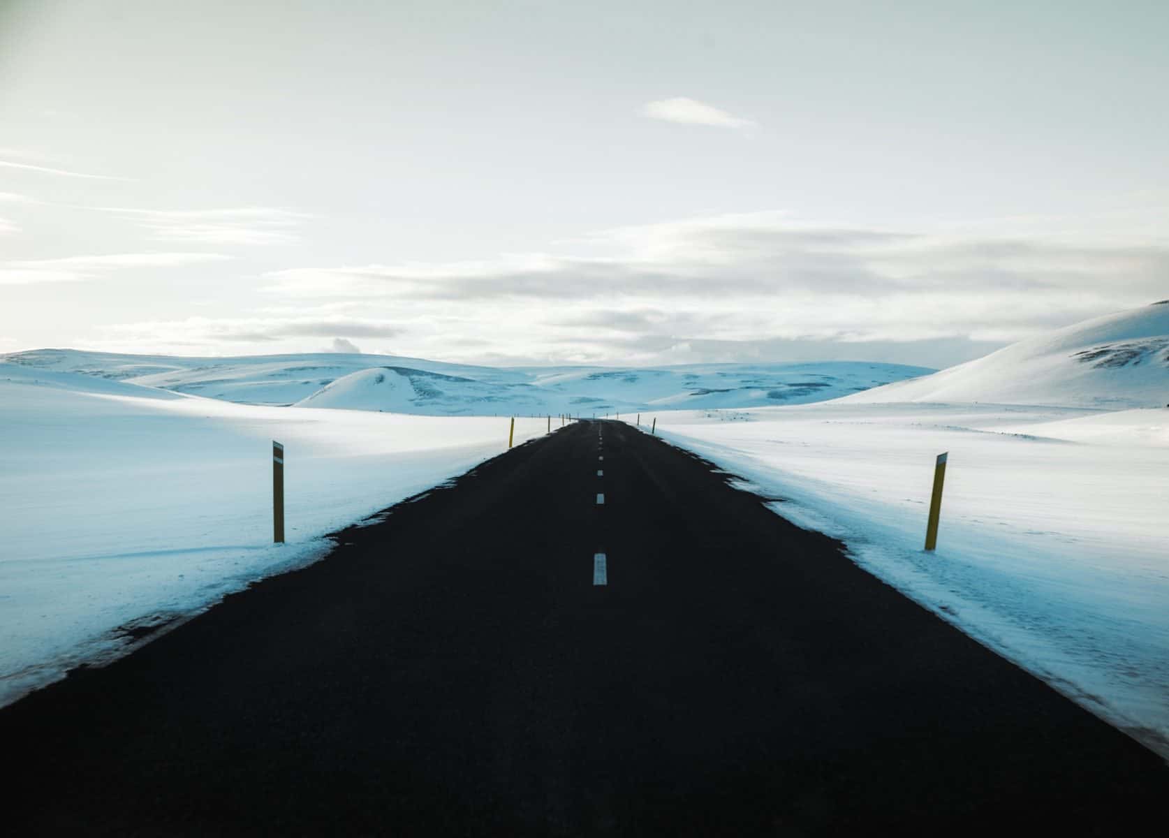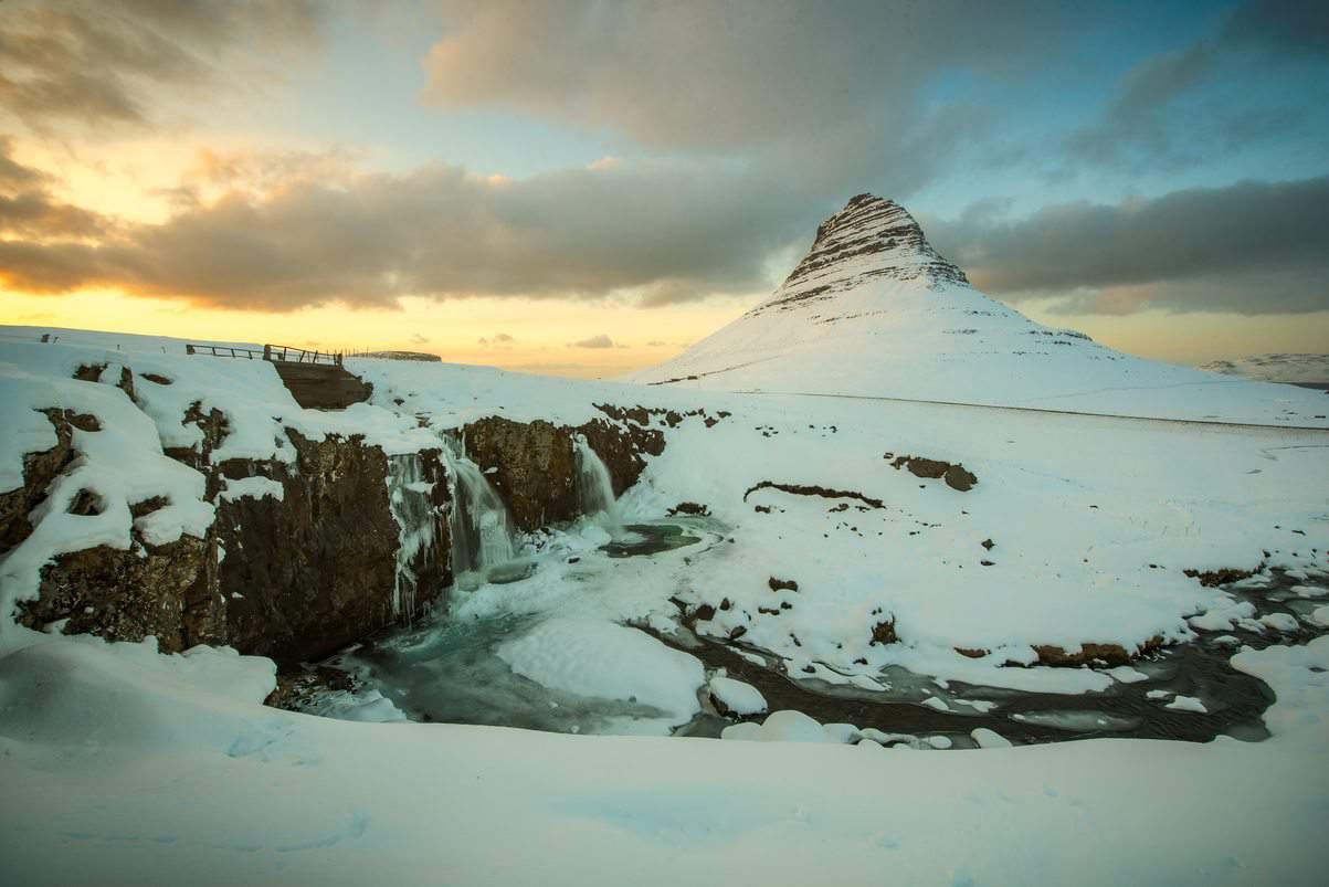 We chased the sun across the snowy plains and arrived at Hverir just in time for sunset. It felt like we were on another planet, standing just feet from bubbling pools of mud and steaming fumaroles emitting sulfuric gas. The numbing windchill had us huddling around the steam vents to warm our hands and camera batteries. We were intending to find Grjótagjá Cave, but by a happy accident we pulled up to Mývatn Nature Baths and spent the evening soaking up to our nose in the lagoon while the hair on our head iced over. After taking advantage of a shower, we camped nearby as more snow fell overnight.