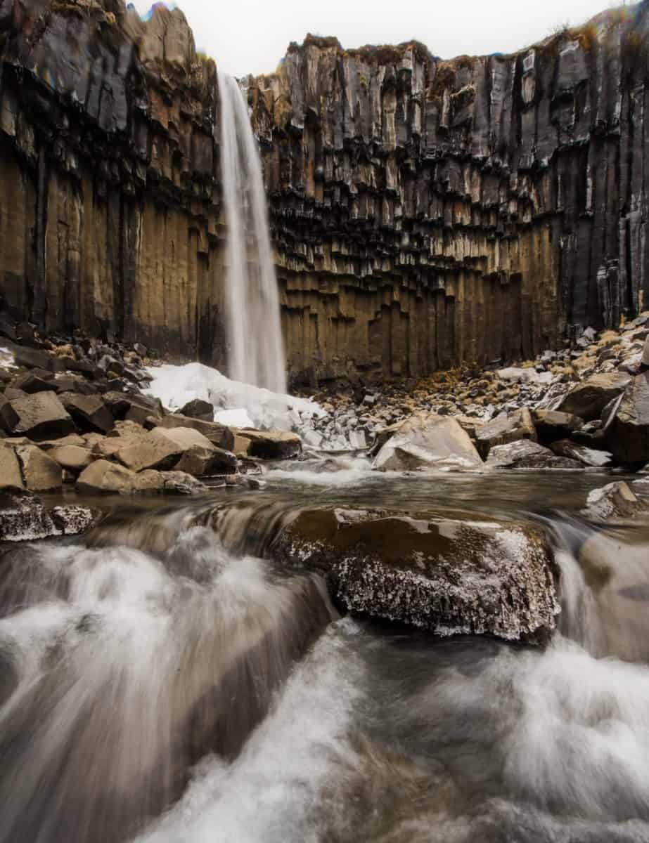 We left Selfoss in the morning and embarked on the ring road in a counter-clockwise direction. Our jaws dropped as we rounded a bend on the highway to see the spectacular Seljalandsfoss. A few miles further down Highway 1, we departed onto a short gravel road to Seljavallalaug, a hot spring pool built in 1923. A beautiful walk up a river valley will lead you to the hot springs. While soaking in the pool, we counted seventeen waterfalls that poured from the mountains around us. We continued to our next stop, Skógafoss. The rising full moon peeked through the clouds behind us while we soaked in the expansive view from the top of the falls.